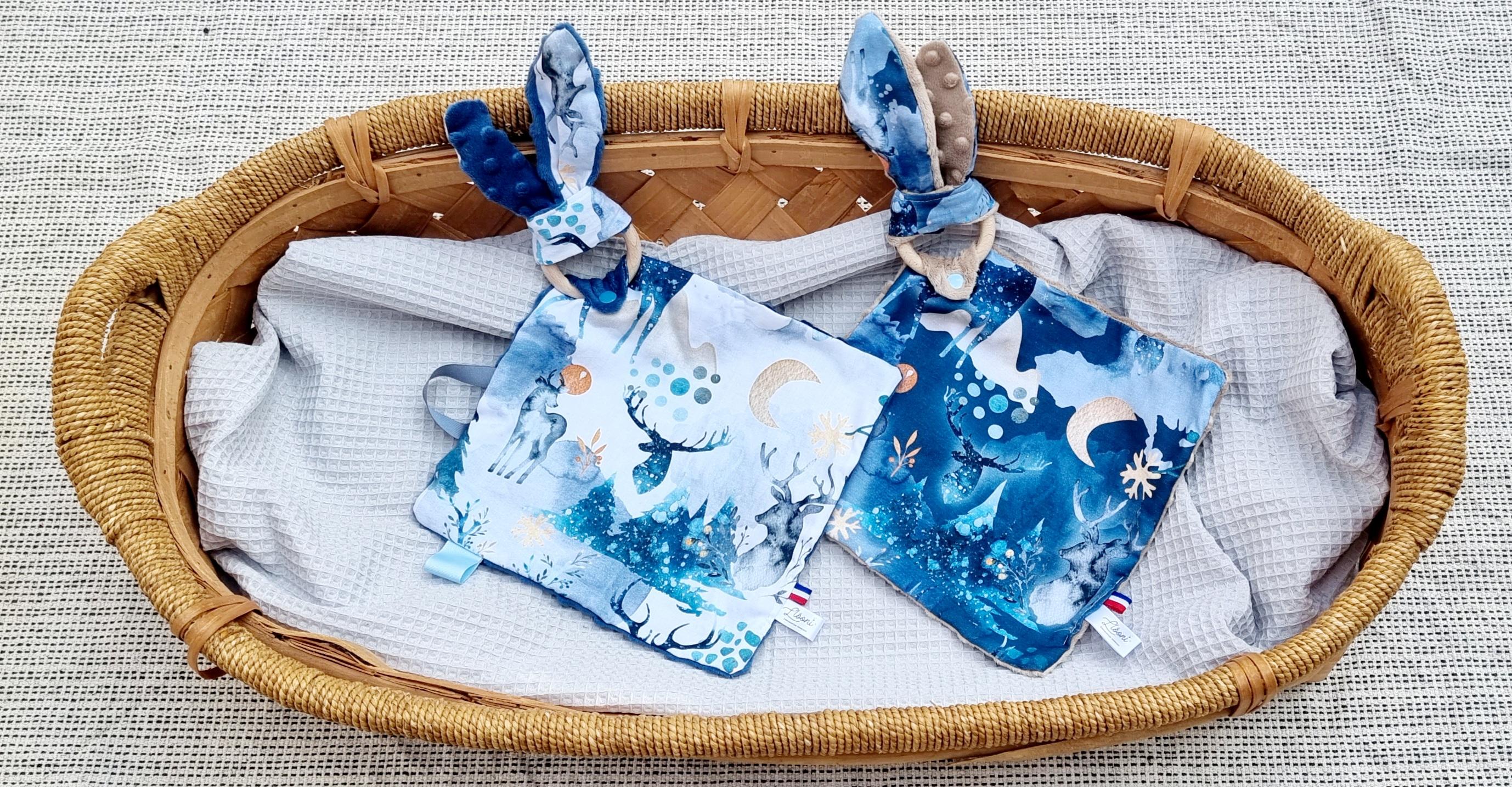Doudou lapin bleu nuit – imprimé cerf d'hiver